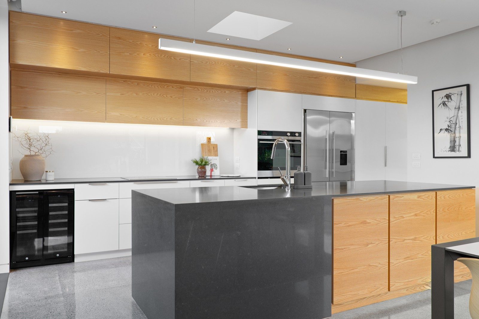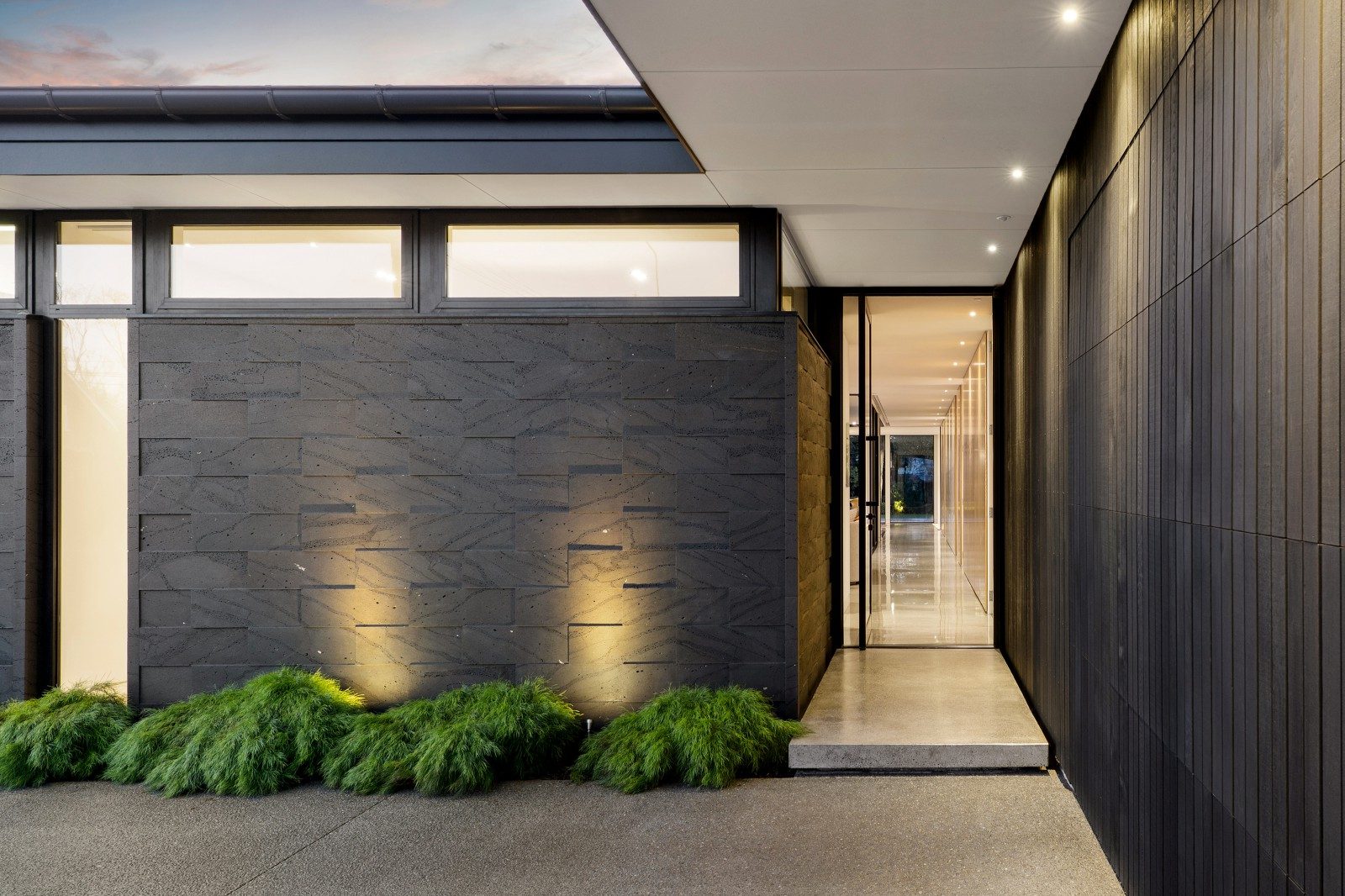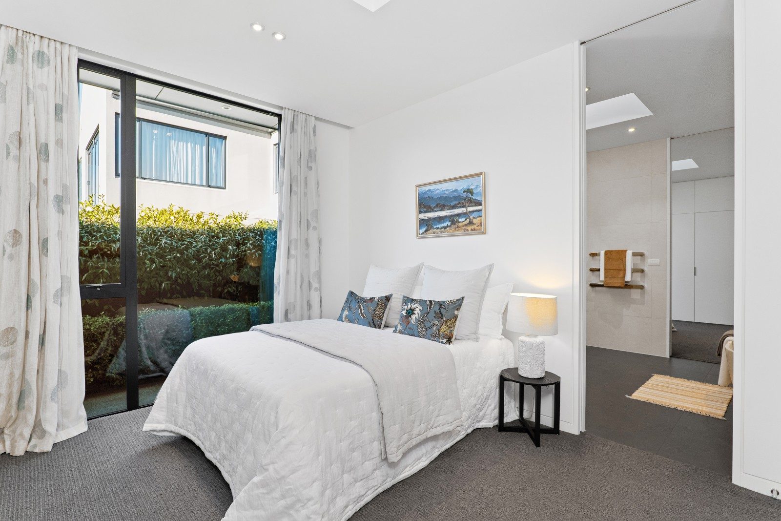 Polished concrete floors, bluestone and travertine detailing establish a refined material palette, while the kitchen and bathrooms designed by Davinia Sutton heighten the aesthetic. Hydronic in-slab heating and dual gas fires ensure consistent comfort.