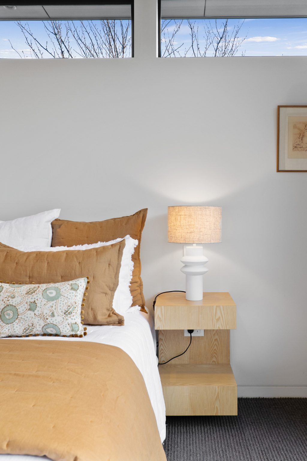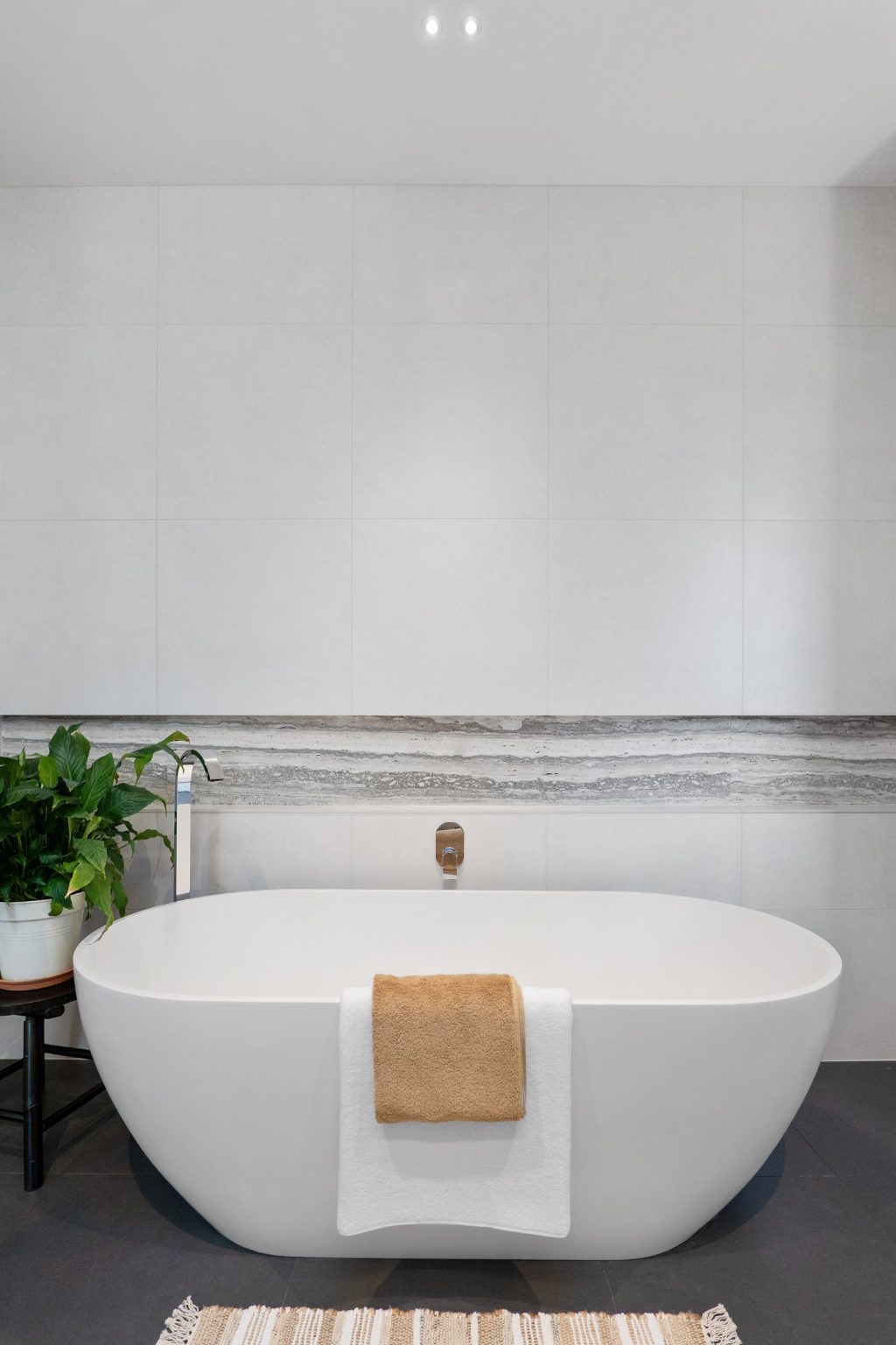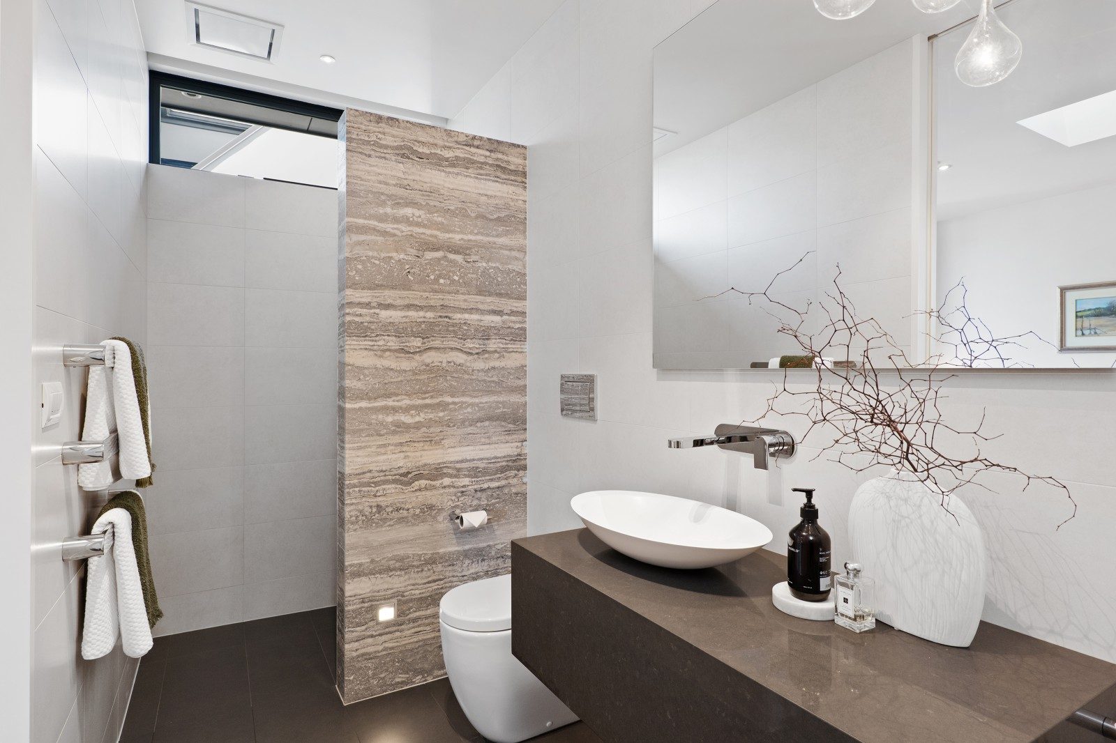 Polished concrete floors, bluestone and travertine detailing establish a refined material palette, while the kitchen and bathrooms designed by Davinia Sutton heighten the aesthetic. Hydronic in-slab heating and dual gas fires ensure consistent comfort.