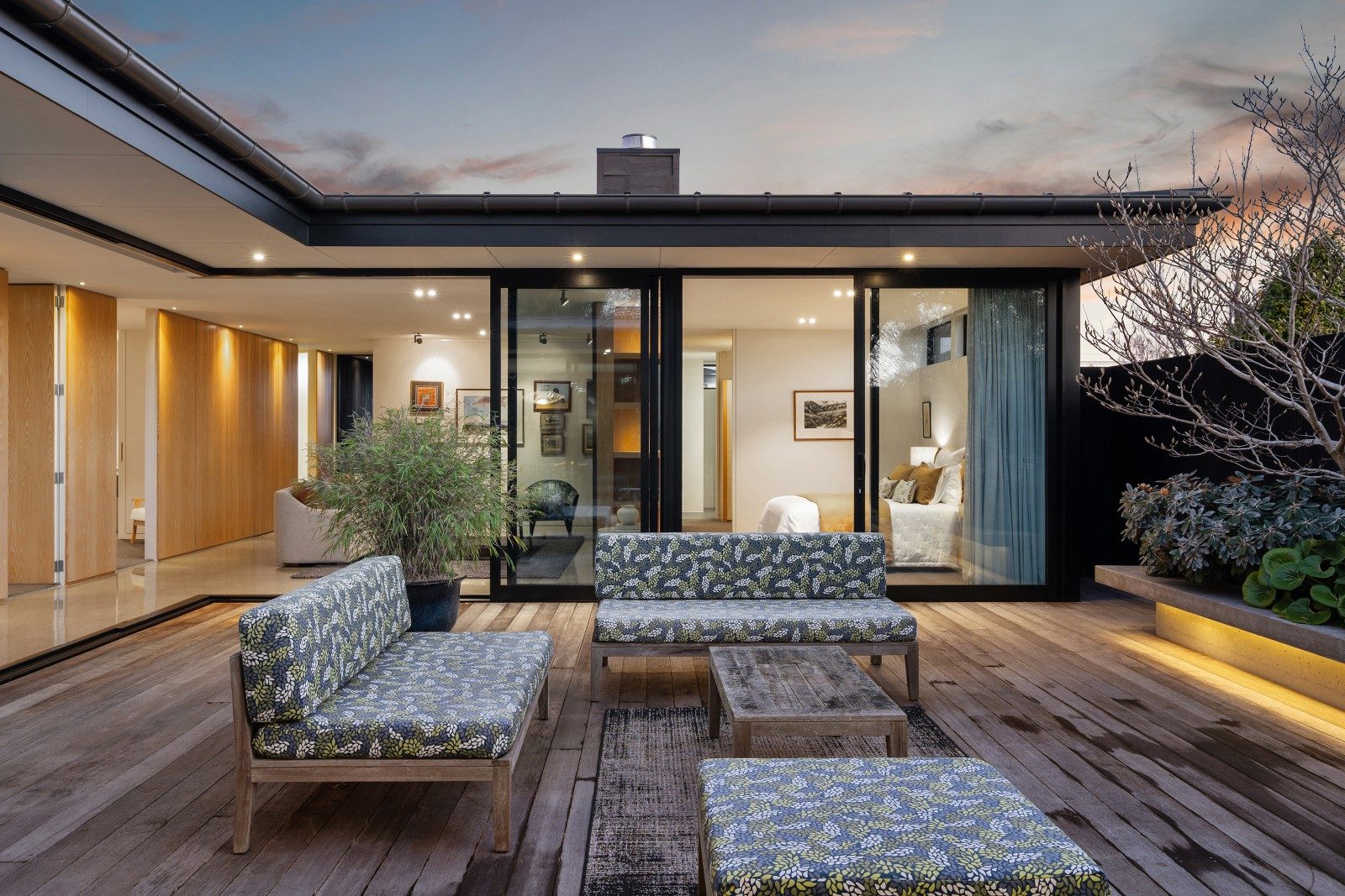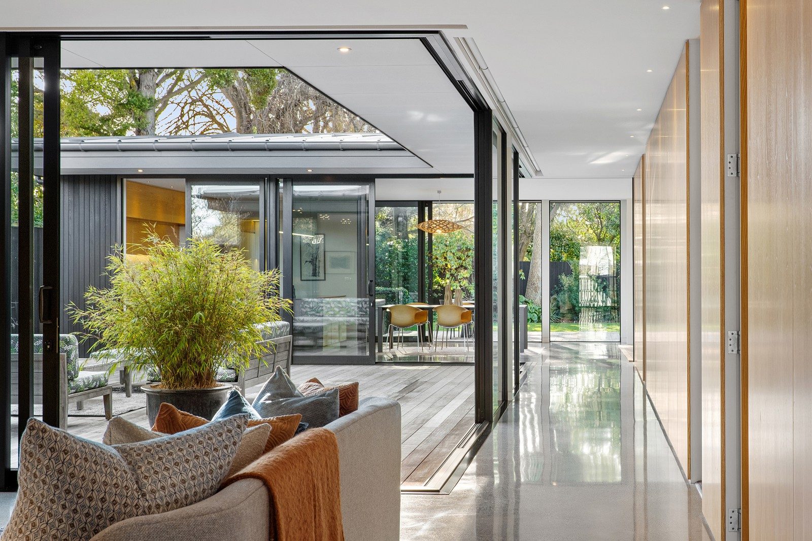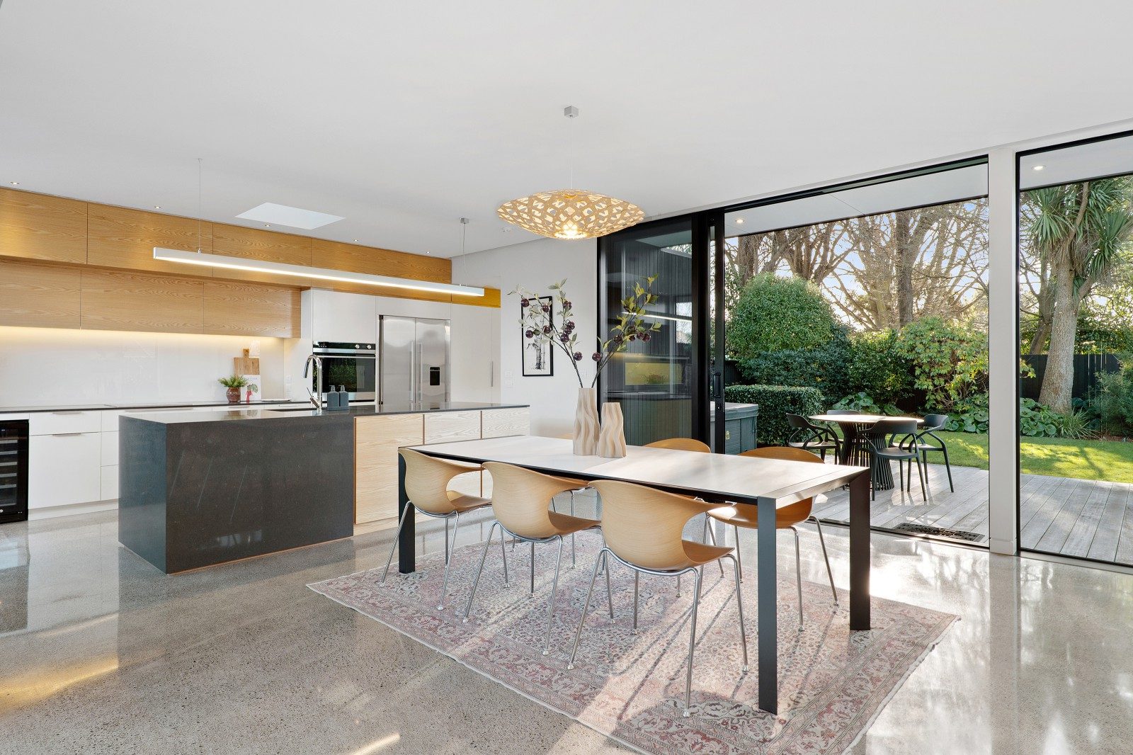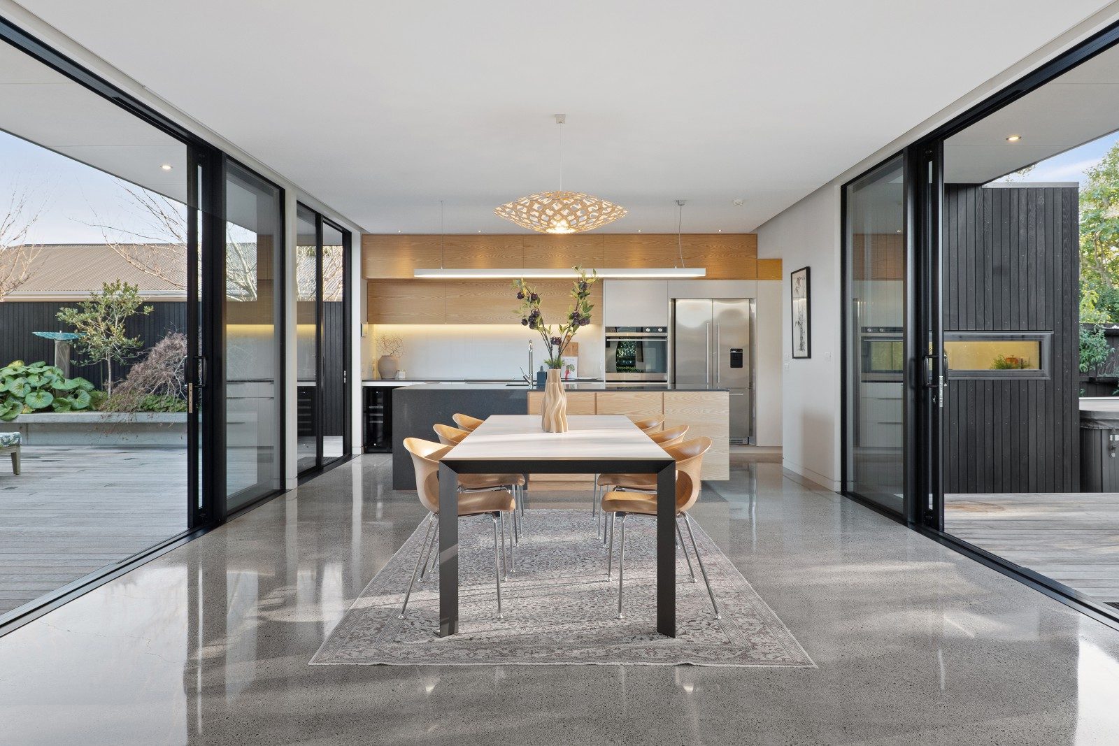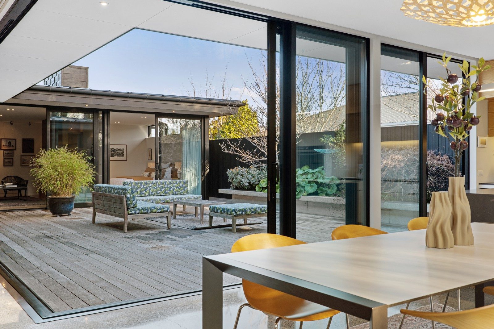 Full-height glazing delivers seamless access to a sequence of decks, each stepping into the landscaped garden and strategically aligned to track the sun throughout the day.