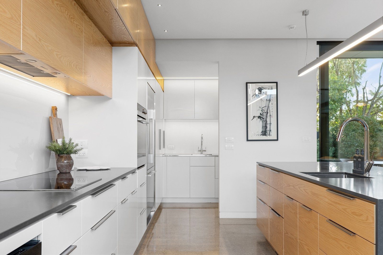 Function and finesse unite in the open-plan living and dining domain, where a sleek kitchen and scullery provide the focus for daily routines and entertaining, accompanied by a separate lounge that lends flexibility to family life.