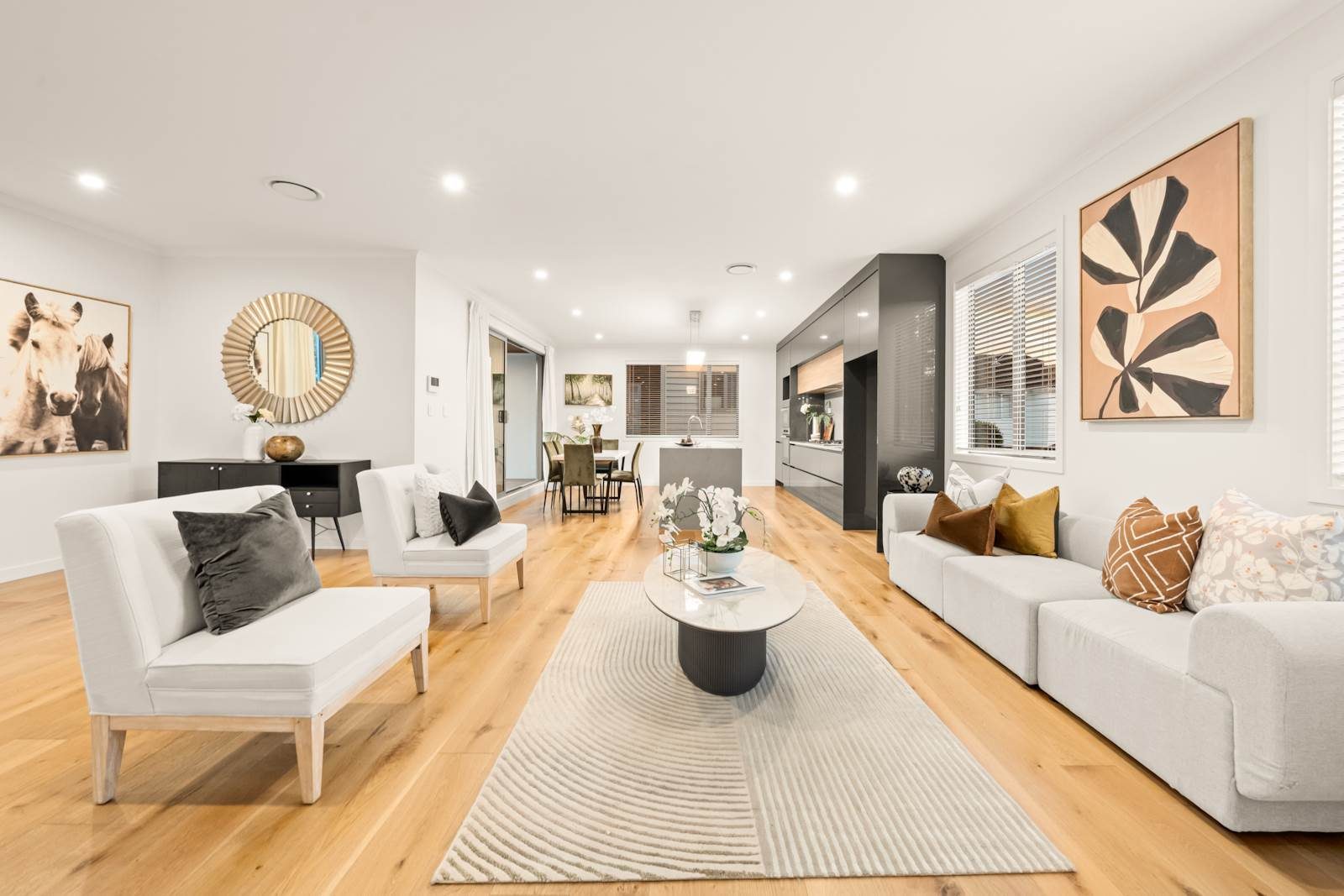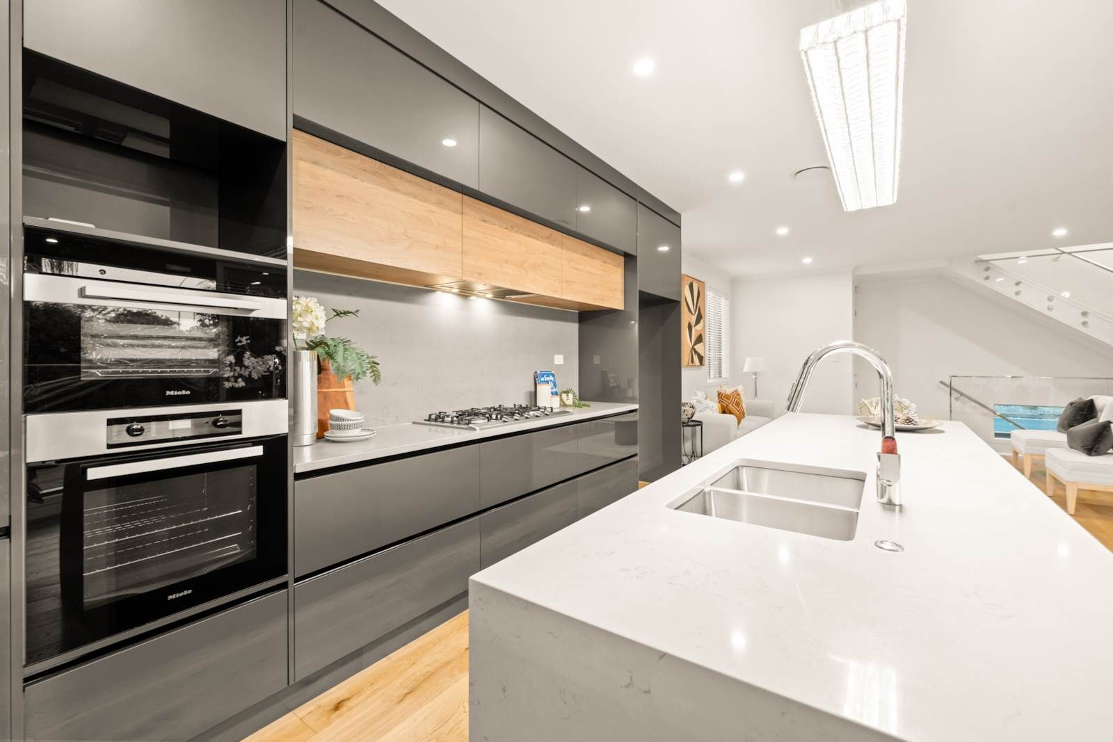 On the main level, you’ll be impressed by the expansive and functional kitchen, fitted with premium Miele appliances, generous bench space, and ample storage. The open plan living and dining area flows effortlessly to a sun-drenched balcony, creating the perfect setting for relaxing or entertaining. The space is further enhanced by a central air conditioning system, which provides year-round comfort across both the main and top floors, and solid timber flooring throughout the living areas.