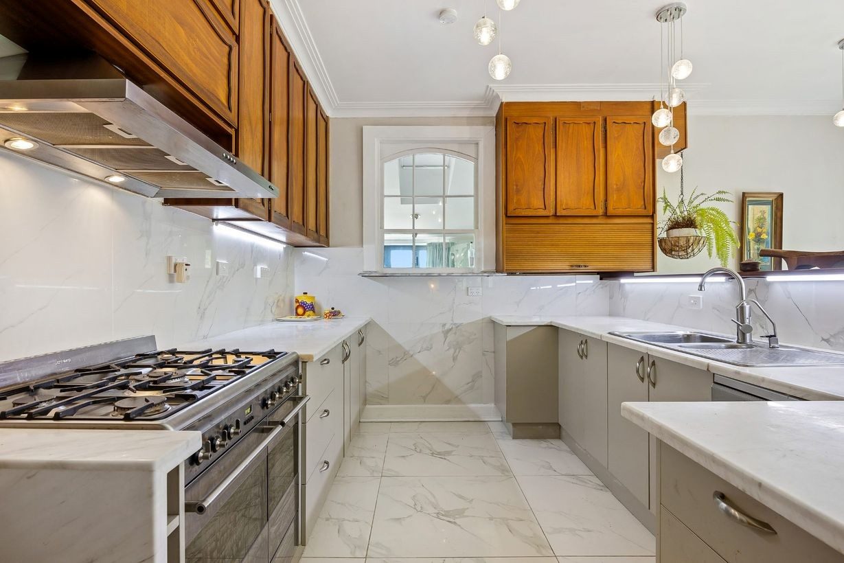 The smeg kitchen with marble benchtops and gas cooking is perfect for entertaining.