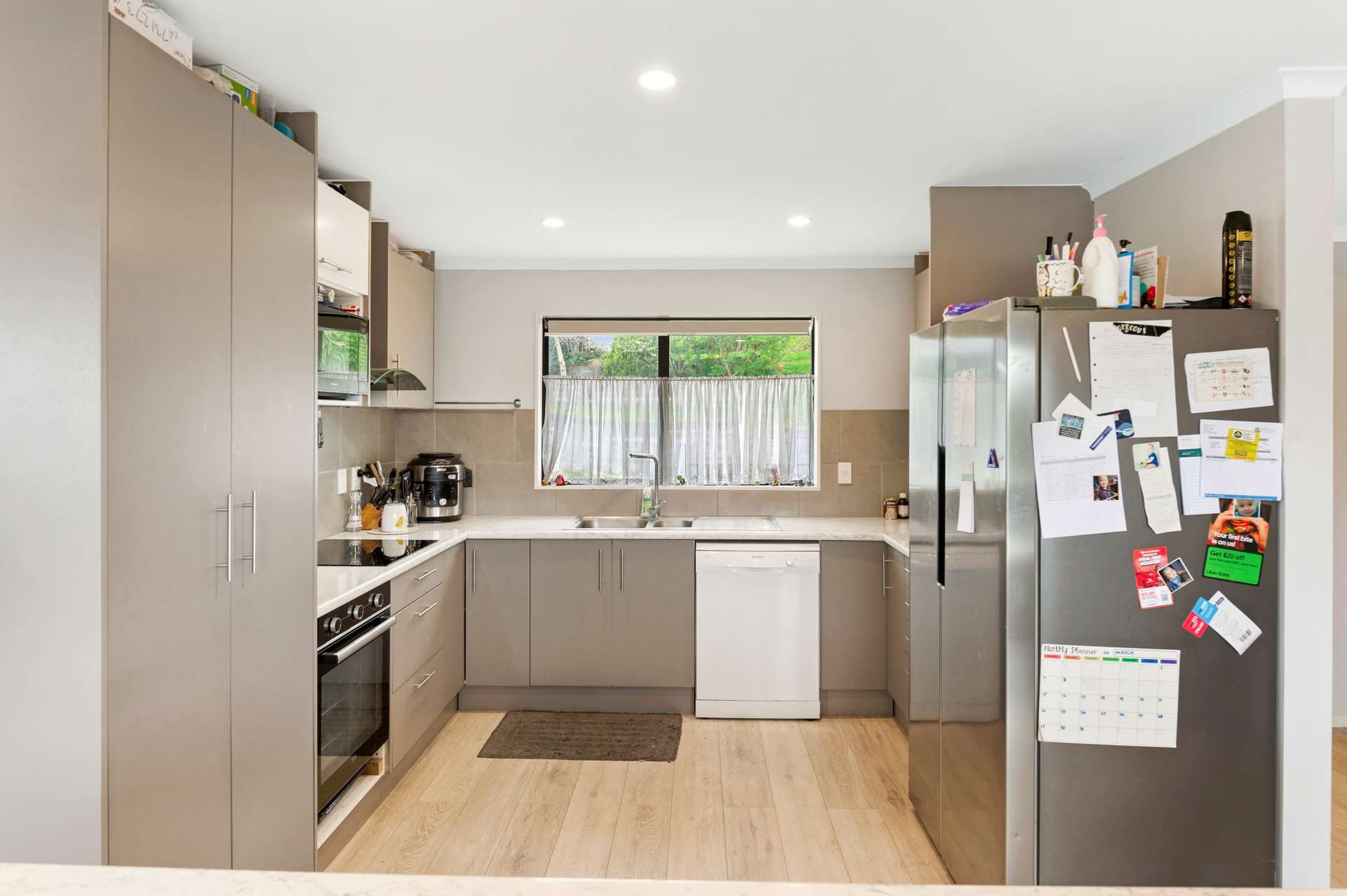 The kitchen is thoughtfully designed with modern appliances, a good amount of bench space and a lovely green outlook. It’s hidden away just around the corner from the living room, offering a slight separation while still feeling connected.